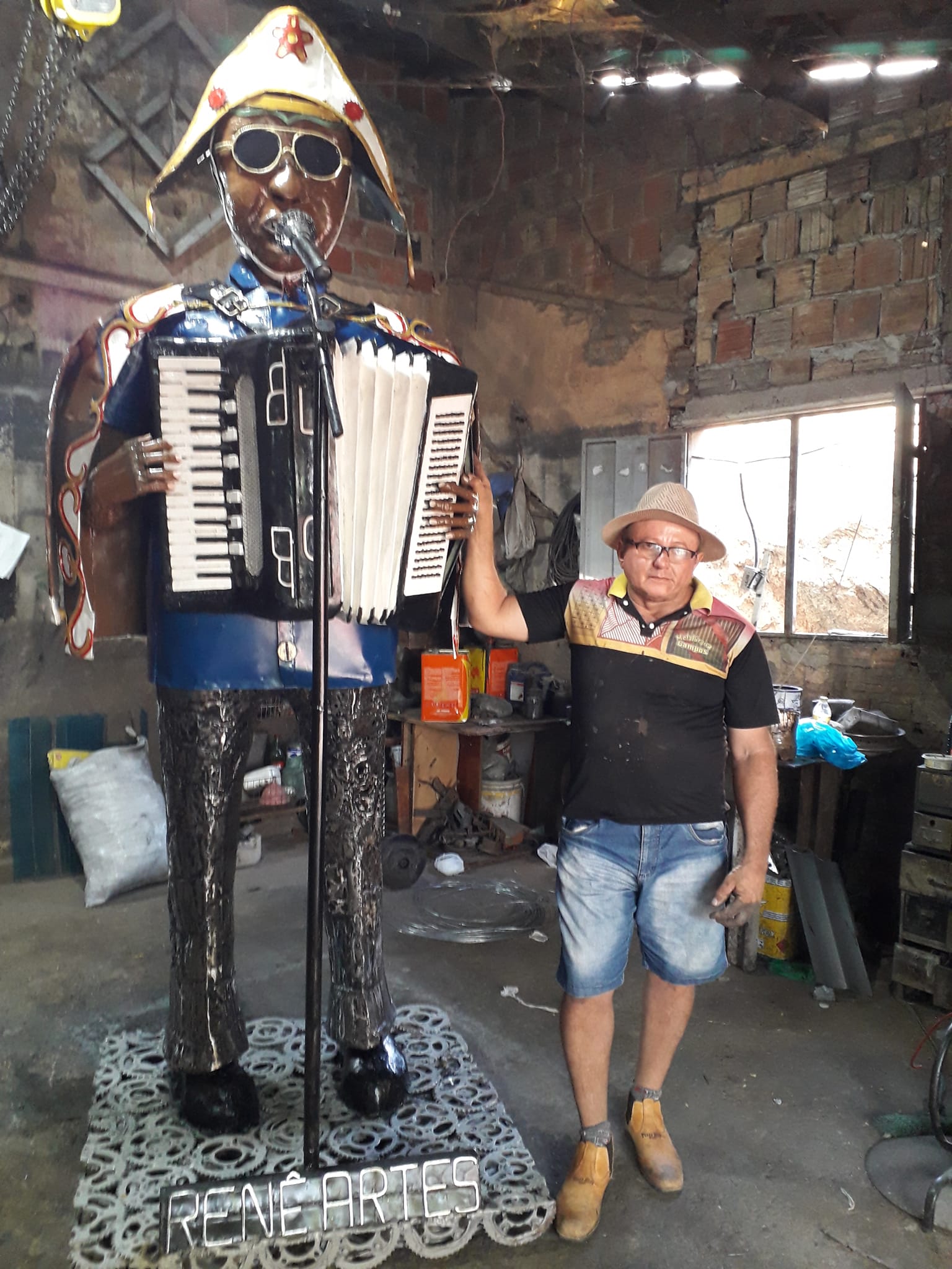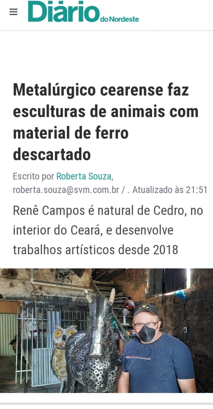 Rene Campos é um artista popular que encontrou no ferro e nas peças descartadas a matéria-prima para transformar sucata em arte. Seu trabalho teve início de forma simples, em sua oficina de ferro-velho, onde diariamente lidava com materiais que já haviam perdido sua utilidade. Foi nesse ambiente que surgiu a inspiração para dar nova vida ao metal, criando esculturas que resgatam elementos da cultura e do cotidiano do sertão.